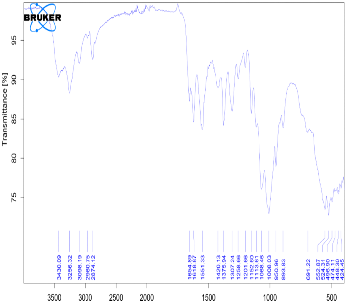 The FTIR study depicted that the chitosan was extracted successfully. The Figure 4 below demonstrates the FTIR spectra of the shrimp shell chitosan extracted. The FTIR spectra shows the characteristic bands of –NH at 3430.09 cm-1 and carbonyl group band at 3256.32 cm-1. The band at 2960.75 cm-1 could be assigned to NH attached to a single bond. Any band which comes after 3000 cm-1 is a double bond attached to the amine group. The band at 3098.19 cm-1 is associated with (N-H) in secondary amides only with trans-configuration and usually is due to the formation of linear associates. Usually, at peak 1750-1800 cm-1 there is C = O. The figure had no peak within that range.