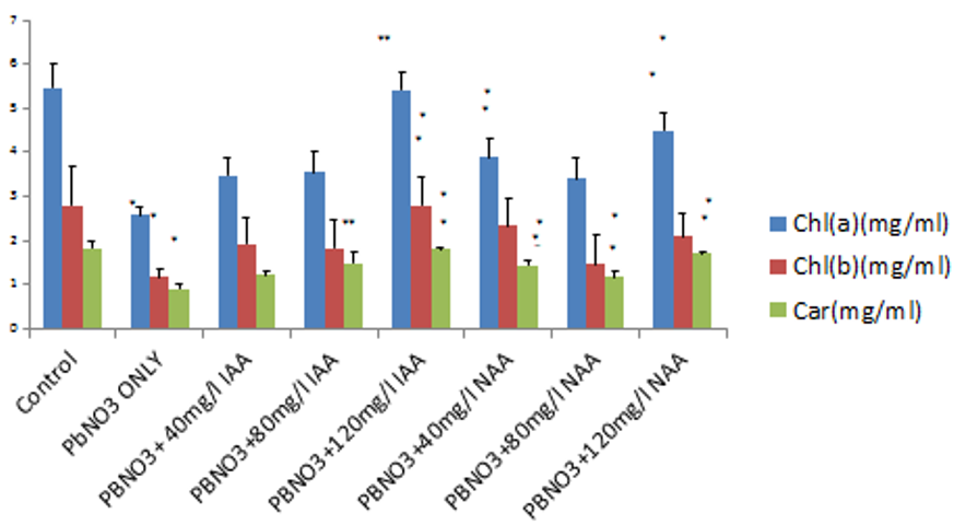 Figure 3. Effect of indole acetic acid and naphthalene acetic acid on photosynthetic pigments of leaf.