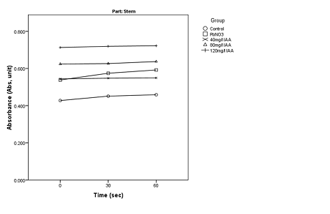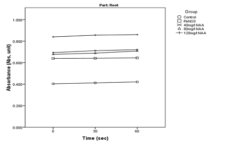 The result in Table 5 and 6 shows that in the root, 120mg/L IAA significantly increased the level of Ca2+, Mg2+,Fe2+,Zn2+ and phosphorus, 80mg/L IAA significantly increased level of Mg2+,K+,Fe2+,Zn2+, 40 mg/L IAA gave no significantly increased the level of these mineral elements. 120mg/L NAA significantly increased the level of Ca2+,Mg2+,K+,Na2+,Fe2+,Zn2+,P. 80mg/L NAA significantly increased the level of Mg2+,K+,Fe2+,Zn2+ and P, 40mg/L NAA significantly increased the level of Mg2+,K+,Fe2+,Zn2+,P.  All concentration significantly decreased the level of Pb2+ except 40mg/L IAA. In the stem, 120mg/L IAA significantly increased the level of Ca2+,Mg2+,Fe2+,K+ and P, 80mg/L IAA significantly increased level of Ca2+,Mg2+,K+,Fe2+ and Zn2+, 40 mg/L IAA  significantly increased the level of Ca2+,Mg2+,Fe2+ and phosphorus. 120mg/L NAA significantly increased the level of Ca2+,Mg2+,K+,Na2+, Fe2+, Zn2+ and P. 80mg/L NAA significantly increased the level of Mg2+, Ca2+,Fe2+ and P, 40mg/L NAA significantly increased the level of Ca2+ Mg2+,K+,Fe2+,Zn2+,P.  All concentration significantly decreased the level of Pb2+. In the leaf, 120mg/L IAA significantly increased the level of Ca2+,Mg2+,K+,Fe2+ and Zn2+,80mg/l IAA significantly increased level of Ca2+,K+,Fe2+  and Zn2+, 40 mg/L IAA  significantly increased the level of Fe2+ and Zn2+. 120mg/L NAA significantly increased the level of Ca2+, Na+ ,Mg2+,K+, Fe2+ and Zn2+. 80mg/L NAA significantly increased the level Fe2+ and Zn2+, 40mg/L NAA significantly increased the level of Ca2+ Mg2+,Fe2+ and Zn2+. All concentration significantly decreased the level of Pb2+ except 40mg/L IAA. This also follow the work of Chandra et al. (2011) that reported alleviating effects of indole acetic acid on adverse effect of toxic heavy metal (Pb, Cd, Cr) and increase in  the nutrient uptake of Zinc and Iron in wheat (Triticum aestivum L) .  Also Rui-Jun et al. (2011) reported that application of IAA alleviate Pb toxicity by creating better root system, plant biomass and regulating the level of nutrient element. Mona, Maymona, and Ibrahim (2013) also reported that foliar application of mixture of IAA+NAA promote nutrient element (N, P, K ,Fe, Zn, Mn) in barley.  Khan, Khan, Sahreen, and Bokhari (2010) reported that application of 0.5m MSA result in an increase of N,P,K & Ca content by 10.1%, 31.6%,19.3% & 19.1% respectively in mungan bean.