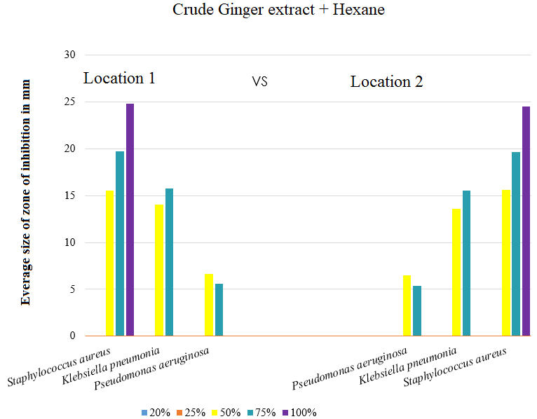 Figure 2. The comparison of the average zone of inhibition formed using ginger extract and hexane in different concentrations from “location 1” and “location 2” against Staphylococcus aureus, Pseudomonas aeruginosa, and Klebsiella pneumonia.