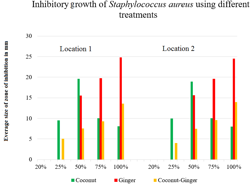 Figure 4. The comparison of the average zone of inhibition formed using ginger extract and hexane, coconut oil and hexane, and coconut + ginger extract and hexane in different concentrations from “location 1” and “location 2” against Staphylococcus aureus.