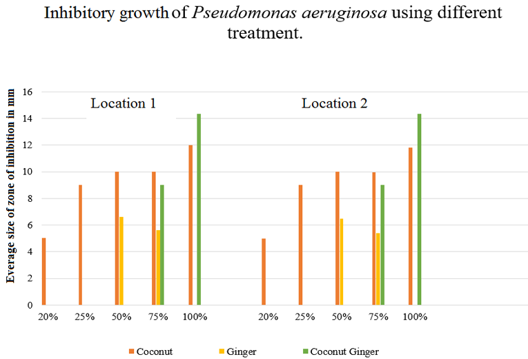 Figure 6. The comparison of the average zone of inhibition formed using ginger extract and hexane, coconut oil and hexane, and coconut + ginger extract and hexane in different concentrations from “location 1” and “location 2” against Pseudomonas aeruginosa.