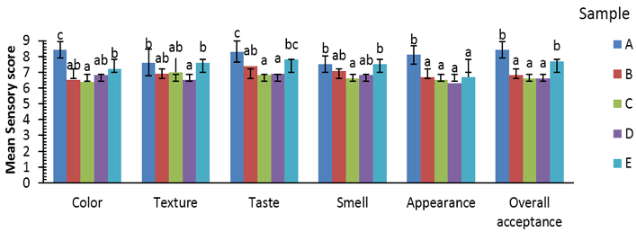 Figure-2. Sensory analysis of the different samples of thekua. Error bars show standard deviation and error bars bearing different superscript differs (P<0.05).