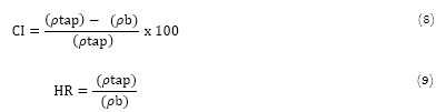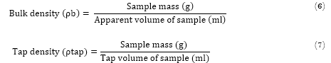 Bulk density and tap density were determined according to the methodology of Dantas, Pasquali, Cavalcanti-Mata, Duarte, and Lisboa (2018) and Equation 6 & 7 were used for its calculation. Powder was poured into a graduated measuring cylinder and the volume occupied was recorded. Similarly, for tap density, the same sample in the measuring cylinder was tapped until no difference was noticed in the scale of the cylinder.