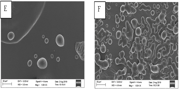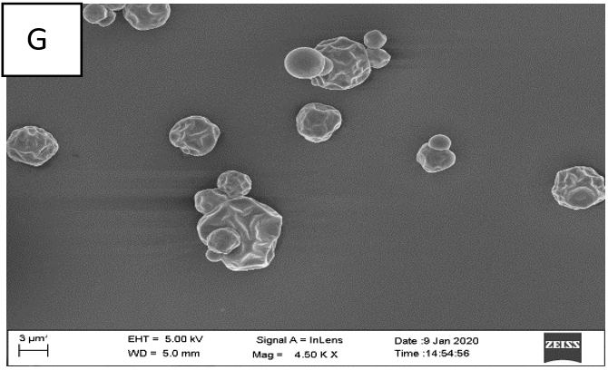Figure 3. SEM images of beverage powder obtained at (A) 168°C and 15% MD (B) 140°C and 15% MD, (C) 140°C and 29% MD, (D) 111.7°C and 15% MD, (E) 120°C and 25% MD, (F) 140°C and 0.89%MD, (G) 160 °C and 19.7% MD.