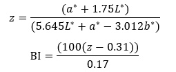 The evaluation of color of smoked raita was done using a colourflex instrument (Hunterlab, Hunter Associates Laboratory, Reston, Virginia, USA) with an in-built Universal software® (Ver. 4.10), and the results were expressed in terms of the CIELAB system. The instrument was calibrated with standard white and black reference tiles. The instrument was set at D65-artificial daylight (10° standard angle) before taking readings. The sample was filled into a standardized glass cell up to 20 mm and placed on the port area (5cm diameter). The data was received in terms of L* (brightness to darkness), a* (greenness to redness), and b* (blueness to yellowness). The readings were taken in triplicate at 25 °C. To calculate the browning index (BI) following equations were used (Bal, Kar, Satya, & Naik, 2011).