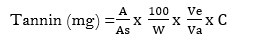 The Folin – Denis spectrophotometric method as described by Pearson (1976) was used. One gram (1 g) of the sample was dispersed in 10 ml distilled water and agitated. This was left to stand for 30 minutes at room temperature and was shook every 5 minutes. After this it was centrifuged at 3000 rpm for 5 minutes to obtain the extract. A quantity of 0.1 ml Folin – Denis reagent was measured into each flask, followed by 2.5 ml of saturated Na2CO3 solution. It was diluted to the mark in volumetric flask (50 ml) and incubated for 90 minutes at room temperature. The absorbance was taken at 250 nm and reagent blank at zero. Tannin content was calculated as follow:
