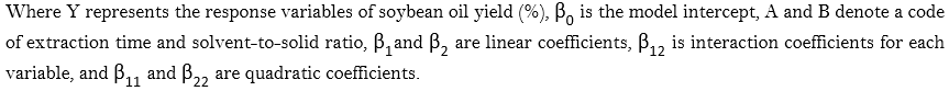 RSM with CCD was used for the analysis and optimization of the interaction effects between variables for Cambodian soybean oil extraction using the CSE method. A CCD was applied to two independent variables with three coded levels (-1, 0, +1) and two un-coded levels (-a, +a), in which a was 1.4142. The independent variables were extraction time (A), ranging from 15 to 45 (min), and solvent-to-solid ratio (B), ranging from 5:1 to 15:1 (mL/g). The three types of solvents used in this study were ethanol, n-hexane, and a mixture of n-hexane and ethanol (Hex:Eth) in a ratio of 2:1. The independent variables with their coded and uncoded values are shown in Table 1.