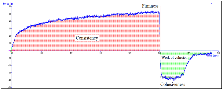 The behaviors of hydrocolloids, when added to pureed foods, can also be examined using the instrumental techniques. A typical textural graph as evaluated by the back extrusion method using the texture analyzer is shown in Figure 2. In addition, the numerical textural properties of pureed banana inflorescences are shown in Table 2.