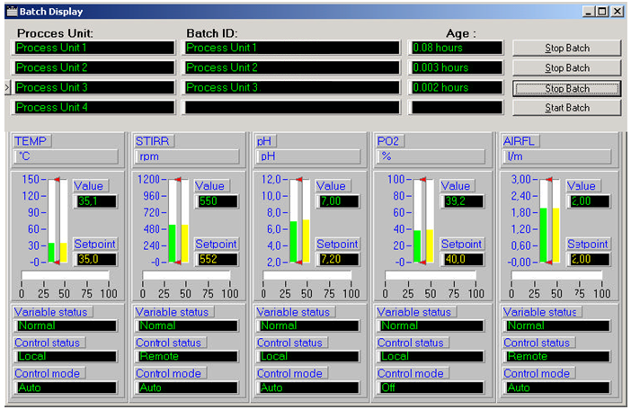 The control unit contains: an integrated control system, integrated pumps, gas flow controllers, control for pH/DO and foam/level, an external computer (with possibility of a touch panel attachment), three peristaltic pumps that can be linked to the acid, base and antifoam/level bottle. The monitoring and control software tool is composed by two distinct software applications: the micro-DCU graphical interface and the MFCS/DA (MultiFermenter Control System - Data Acquisition) application (Fig. 3), which allows a “batch-oriented” data management. The control structures that can be implemented are simple or cascaded control loops: control of stirrer speed, temperature, pH and pO2. The controllers are of PID (proportional – integral – derivative) type, and can be tuned by using, for example, Nichols, Ziegler-Nichols and Hokushin methods.