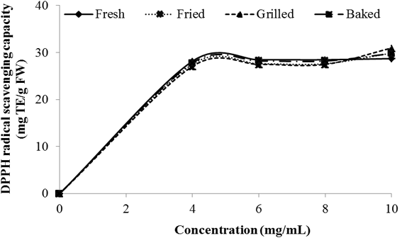 Cooking methods were shown to affect the contents of nutrient and health-promoting compounds such as carotenoids, vitamin C, polyphenols in vegetables (Sahlin et al., 2004; Lin and Chang, 2005; Chuah et al., 2008; Adefegha and Oboh, 2011; Murador et al., 2014; Arkoub-Djermoune et al., 2016; De Santiago et al., 2018). However, there is lack of information on the effect of some domestic cooking method like griddling, frying and baking on the physicochemical properties and antioxidant activities of Algerian tomato. Because modern-day consumers seek to avoid aggressive cooking methods which may affect the functionality of foods, there is growing interest in the phytochemical profiles and antioxidant activities of cooked (boiled, microwaved, steamed, grilled, fried, and baked) vegetables.