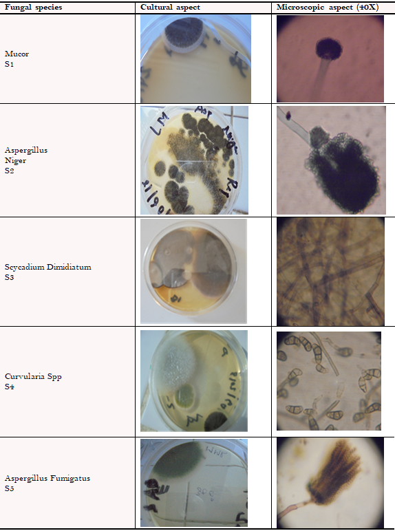 A total of fifty species have been isolated in all the samples. Among these fungal species, Aspergillus Niger is the more abundant (40%) followed by Aspergillus fumigatus (26 %) and Mucor spp (20 %). Scycadium dimidiatum is the less representative fungal species. The frequency of each isolated fungal is as showed in Table 2.