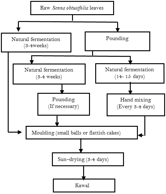The production of kawal is a traditional process involving different unit operations with the most important being fermentations and drying after harvesting of the leaves. The technologies used in kawal production are often applied on a small scale and still mainly at the household level, characterized by the use of simple and rudimentary equipments under poor hygenic conditions. These technologies remain traditional with the empirical knowledge and the know-how is transmitted from mother to daughter and from generation to generation. Different varieties of technologies processes in kawal production depending on the sites and producers Figure 3 was observed in this study and the essentiel operation are the fermentation and drying. The flow general chart of the processing line of Senna obtusifolia fresh leaves to Kawal food condiment is presented in Figure 4.