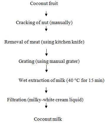 Method of Edem and Elijah (2016a) was adopted for extraction of coconut milk. The coconut milk was unshelled with a knife and the meaty portions removed, washed, and grated using a traditional coconut grater with particle size < 1617 µm. The grated coconut was mixed with distilled water (1:1) in beaker and allowed to stand in water bath for 15 minutes at temperature 40 oC. The slurry was then pressed and filtered through cheese cloth to obtain coconut milk, as presented in Figure 1.
