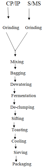 Figure-1. Flowchart for the production of enriched garri from completely peeled (CP), incompletely Peeled(IP) cassava, Soybean(S)/Melon Seed(MS).
