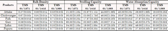 Results of the functional properties of the biofortified cassava products Table 4 showed that Attieke, from variety TMS 01/1412 had highest Bulk density (0.92 g-1ml) while Lafun from variety TMS01/1368 had the lowest (0.55 g-1ml). A study by Ukenye, Ukpabi, Chijoke, Egesi, and Njoku (2013) recorded lower figures than these, with a range between 0.51±0.02 and 0.59±0.03. Gari samples from TMS 01/1371 had highest swelling capacity (60.33%) followed by Pupuru and Gari from variety TMS01/1368 (58.33%).
