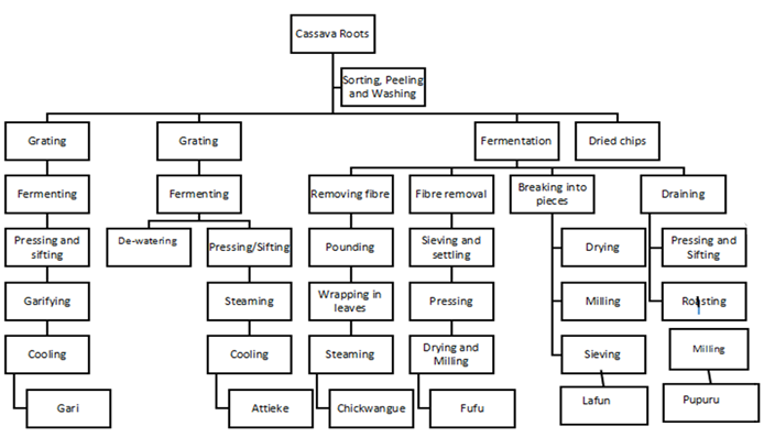 Figure-1. Flow chart for the processing of Dried chips, Attieke, Chickwangue, Gari, Fufu and Pupuru.