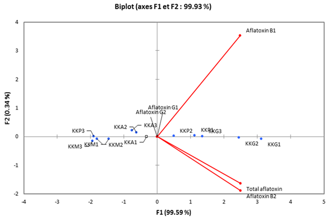 The Principal component analyses reveal that the F1 and F2 axes report 99.93% of the information on the aflatoxins content in the analysed samples Figure 2. Thus, vectorially, aflatoxin B1 is opposed to total aflatoxin and aflatoxin B2. Aflatoxins G1 and G2 are not active variables in the construction of the axes F1 and F2. According to the axis F1, samples KKG2, KKG1, KKG3, KKP1 contained high quantity of aflatoxin B1 and B2. Unlike of samples KKP2, KKP3, KKA2, KKA3, KKM3, KKM1, KKM2, KKA1 which have low content of aflatoxins B1 and B2 according the axis F2.