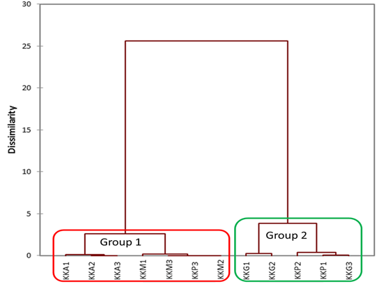 Ascending hierarchical classification (AHC) gives a dendrogram grouping the analysed samples at two groups according to aflatoxins content Figure 3. The first group consisted of the samples KKA1, KKA2, KKA3, KKM1, KKM2, KKM3 and KKP3. The second group consisted of the samples KKG1, KKG2, KKP2, KKP1 and KKG3.