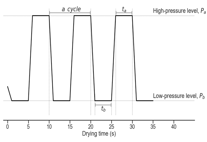 Figure 2 describes the SPD dehydrator set up. Each test started with compressor activation (Figure 2, B). Pa was established using a pressure regulator (Figure 2, D). The first cycle began with the opening of the valve F, to establish the Pb level in the treatment chamber (Figure 2, G) (in this case, Pb equals to atmospheric pressure, Patm). Then, valve F remained closed during the base pressure phase (tb) and then, the valve D was open to pressurize the treatment chamber. Finally, the valves D and F were closed during the pressurizing phase (ta). Subsequently, the cycle was repeated until test duration was reached.