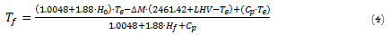 The Thompson model also allows a post-drying heat balance to determinate the air and the dried product temperature (Tf) after the time interval (Δt). It is assumed that the moisture lost by the product (ΔM) is removed by air, which increases its humidity ratio to Hf. Equation 4 allows this calculation.