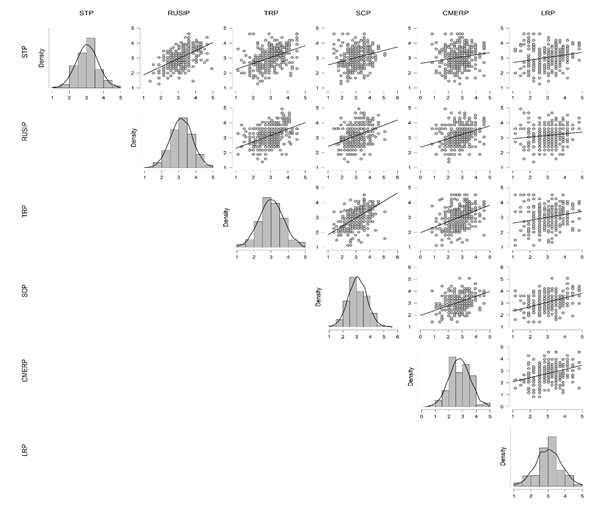 Note: *p<0.05, **p<0.01, STP: Skills and training related problems, LRP: learner related problems, CMERP: course management and evaluation related problems, RUSIP: resource using skills and infrastructure related problems, TRP: teaching related problem, and SCP: support and collaboration related problem. |