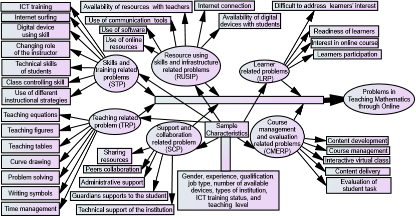 The items related to skills and training of teachers were considered under this category as ICT training, Internet surfing, digital device using skill, changing role of the instructor, technical skills of students, class controlling skill and use of different instructional strategies. Problems of ICT training represented the training focusing on the use of digital tools in instructional practices which were highly important during instructional practices. Problems of internet surfing represented the challenges faced by mathematics teachers while searching course related books, articles, tutorials, and professional development related online courses. Problems of digital devices using skills represented issues faced by teachers while using digital devices as mobile, laptop/computer, and digital boards in their instructional practices and problems on changing role of tutor represents the role of teachers while they forcibly transformed their instructional activities from face-to-face to online without readiness cause of immediate pandemic. Additionally, problems of technical skills of students represented their skills for the use of digital devices and resources including to handle minor errors or problems for their learning practices, class controlling skills representing the unnecessary noise and disturbance related issues during online classes, and use of different instructional strategies representing the challenges faced by teachers using learner centered and project-based learning.