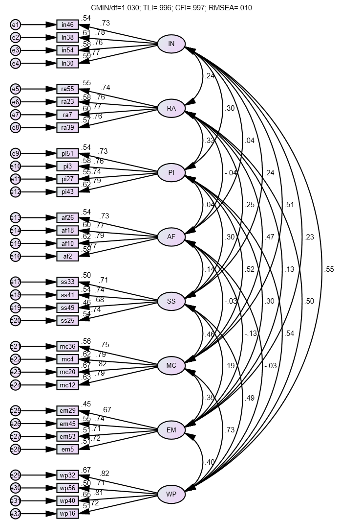 Table 2 displays the results of descriptive and inferential analyses. The eight subscales of the SLEQ had means and standard deviations of from 3.06 (0.58) to 3.37 (0.60). The corrected item-total correlation values of all items indicated the discriminant capacity of each item (ranging from 0.41 for item 16 to 0.77 for item 38) (Nunnally & Bernstein, 1978). In addition, Cronbach’s alpha values of all subscales were satisfactory (α = 0.84 for IN, α = 0.83 for RA, α = 0.84 for PI, α = 0.85 for AF, α = 0.80 for SS, α = 0.86 for MC, α = 0.80 for EM, and α = 0.85 for WP) (DeVellis, 1991). The SLEQ and the eight subscales had high correlations, ranging from 0.22 to 0.80, indicating that the SLEQ had good convergent validity. The correlations between the eight subscales were moderate positive ranging from 0.10 to 0.62. Therefore, these subscales of the SLEQ were distinct.