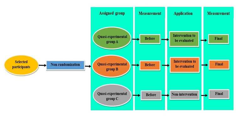 A semi-structured survey was conducted among 103 undergraduate nursing students (conveniently sampled from the total population, N = 2,490). The students were divided into three groups: intervention group A (38 undergraduate nurses), intervention group B (32 undergraduate nurses), and control group C (33 undergraduate nurses), as shown in Figure 3 .
