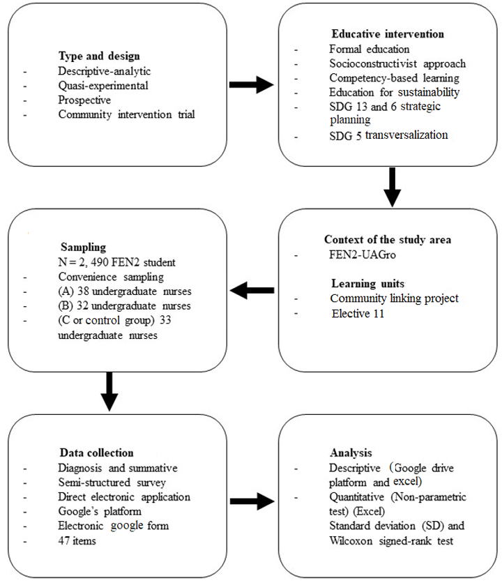 Exploratory-descriptive research was performed to clarify the research problems. Meanwhile, the participant’s response was measured prospectively using a semi-structured questionnaire. Besides, a non-randomized intervention using the quasi-experimental design evaluated before and after the intervention to deconstruct the environmental sustainability competencies concerning the prevention of water quality, conservation, and efficient use at home in undergraduate nursing students (Figure 3).