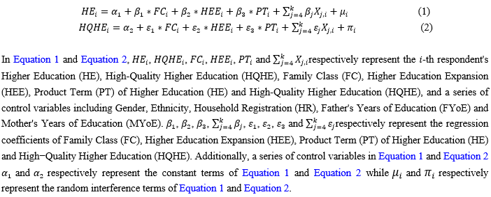 Given that the dependent variables Higher Education (HE) and High-Quality Higher Education (HQHE) were both binary discrete variables, this study chose to construct the logit models to more accurately estimate the effects of Family Class (FC) and Higher Education Expansion (HEE) on Higher Education (HE) as well as High-Quality Higher Education (HQHE). In addition, to examine whether there was a moderating effect of Higher Education Expansion (HEE) on the relationship between Family Class (FC) and Higher Education (HE), High-Quality Higher Education (HQHE), this study also introduced Product Term (PT) of Family Class (FC) and Higher Education Expansion (HEE) in the model. The specific estimated models were constructed as follows.