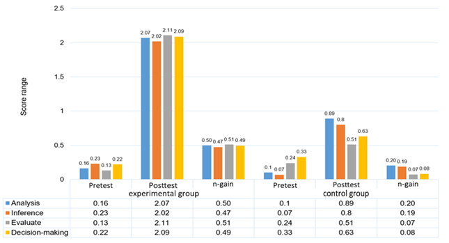Each data on students' CT skills (pretest and posttest) in the experimental and control groups was analyzed descriptively and statistically. Descriptive analysis refers to the criteria seen in Table 3. The increase of the pretest-posttest score of students' CT skills (n-gain) was analyzed according to Hake's formulation (Hake, 1999) and categorized into n-gain criteria: low (<0.3), moderate (0.3 – 0.7), and high (>0.7). Statistical analysis (differential test) was employed to analyze the differences in students' CT performance in each treatment group (based on the pre-test-posttest mean score parameter) and between treatment groups (based on the post-test mean score parameter), both at the level of 0.05 significance. This difference indicated the effect of the intervention or learning treatment. The statistical difference test was preceded by a normality test. If the results of the normality test indicated that the data was normally distributed, parametric statistical analysis was used. Otherwise, non-parametric statistical analysis would be used. Statistical analysis employed SPSS software.