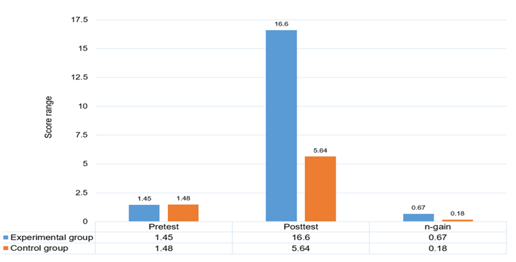 The Kolmogorov-Smirnov and Shapiro-Wilk tests were employed to measure the normality of the data in experimental and control group. The results of the normality test based on the pre-test and post-test parameters were none of the test variables were normally distributed. The data tested were not normally distributed (p-value < 0.05). Based on these results, the different test used the non-parametric statistical analysis. The paired sample difference test employed the Wilcoxon test. For the independent sample, the Mann-Whitney U test was applied. The results of the two tests are summarized in Table 5 and Table 6.