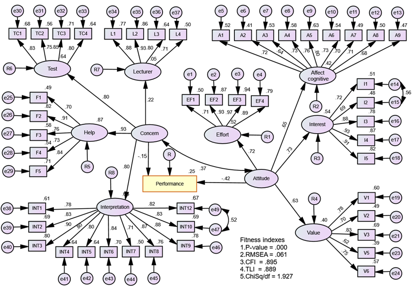 Figure 2 shows the standardized regression path coefficients between constructs. The coefficient of multiple determination of the model indicates that about 25% of the students' performance in statistics concept examination was explained by their attitude (affect, interest, value and effort) and concern (interpretation, test, help and lecturer) level towards statistics, while the other 75% was influenced by others.