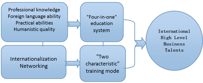 The high end business talents proposed in this research refer to “high level global business management talents with strong foreign language ability, excellent professional knowledge, strong practical abilities, high quality of personality, and outstanding cross-cultural communication skills” including the ability to evaluate the education quality. Combining the evaluation standards of three major international accreditation organizations and the training experience of their Business School, Guangdong University of Foreign Studies, where the authors are located, initiated a “4+2” training model for evaluating high end business talents (as shown in Figure 1):