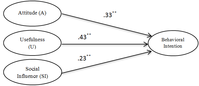 Accordingly, behavioral intention (BI) measures a person’s intention whether or not to carry through a specified behavior (Fishbein and Ajzen, 1975). Davis et al. (1989) stated that BI determined the adoption of technology, while BI is determined in turn by a person's attitude toward using it (A) and its perceived usefulness (U), or BI = A + U; their attitude is considered an essential determinant in their acceptance of the technology (King and He, 2006). Similarly, a user’s perception of usefulness (U) in this model plays a key role in determining their intention to use a system (Burton-Jones and Hubona, 2006).