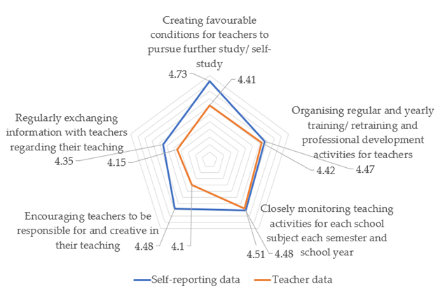 The ability of school leaders in supporting teachers and developing teachers’ teaching capacity were ranked high in both self-reporting and teacher data (see Figure 4). School principals all agreed on the crucial role of teachers in the quality of education and students’ learning outcomes, and therefore had paid special attention to supporting, training, and monitoring teachers. Professional development activities, including training new teachers and retraining existing teachers on teaching pedagogies and subject matter knowledge were reported to be regularly organised. Teachers were assigned to their subject units where they had weekly and monthly meetings to exchange knowledge and experience, and to discuss weekly and monthly teaching plans. Subject heads then reported these to school principals who then advised on further actions. School principals believed that they were very supportive of teachers’ professional development plans, such as pursuing a higher degree or attending external training courses or workshops, and they created all possible favourable conditions for teachers such as reducing teaching workload and arranging flexible teaching options.