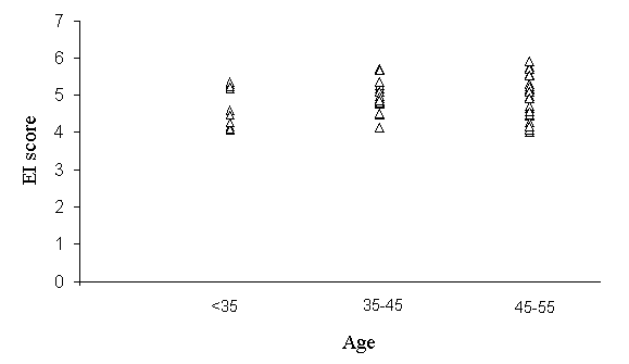 Considerably high EI scores (mean score 4.98±0.57) were observed: Table 1 shows a small proportion of participants had EI scores either below 4 (1.61%) or above 6 (1.76%), while the majority had mean EI scores between 4 and 5 (49.18%) and 5 and 6 (47.54%).