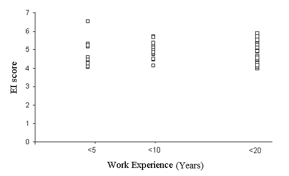 Figure-2. Emotional intelligence plotted against teachers with three periods of work experience (<5, <10, and <20 years).