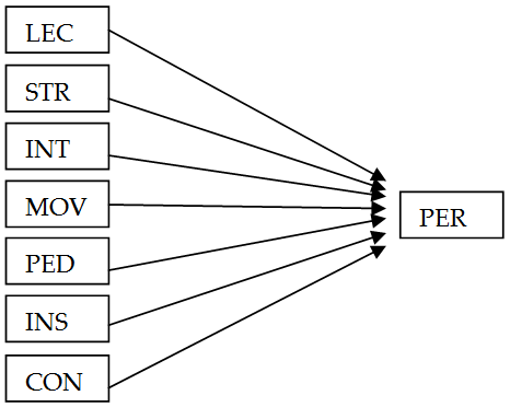 LEC: Lecturers’ professional knowledge and credential; STR: Course structure; INT: Classroom interactions; MOV: students’ motivation; PED: Lecturers’ pedagogical knowledge and skills; INS: students’ course preference; CON: educational resources and learning conditions; and PER: students’ academic performance.