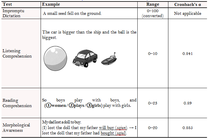 Listening comprehension and morphological awareness were examined using Lee et al.’s (2015) standardized Language Scale for School-Aged Children (LSSC). The listening comprehension test consisted of three simple and seven complex sentences that students were asked to listen to and then choose one picture from four possibilities that correctly depicted the content of each sentence. The morphological awareness test comprised 10 sentences in each of which students were asked to correct the grammatical errors, which existed within the form (e.g., tense ending, suffix, or postpositional particle) rather than arrangement of the words. Having listened to a sentence, students were awarded 1 point for correcting the error and rewriting the morphological composition accurately.