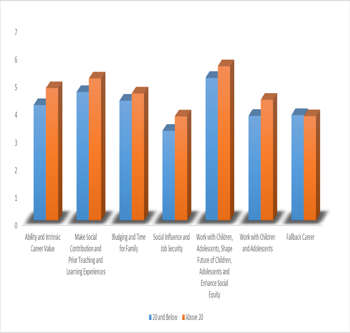 The findings in relation to motivational factors according to gender revealed that women were more intrinsically motivated than men: Ability/Intrinsic Career Value; Bludging/Time for Family; and Work with Children/Adolescents/Shape Future of Children/Adolescents/Enhance Social Equity. Although this agrees with those of Erten (2014) and Korb (2010), it disagrees those of Topkaya and Uztosun (2012), which found that both male and female preservice students were motivated to become teachers for the same altruistic, intrinsic, and extrinsic reasons. However, as early as 1999, Johnston, McKeown, and McEwen asserted that extrinsic motives, such as salary, motivated men while women were intrinsically motivated. In general, the role of mothers in caring for their children is highly valued in African culture, which may influence women’s choice of teaching that also involves caring and nurturing children. The results from this study also showed those students aged over 20 were more motivated by Ability/Intrinsic Career Value, Make Social Contribution/Prior Teaching and Learning Experience, and Social Influence/Job Security than those under 20. In an era of unemployment, it is not surprising that job security is important to the more mature, who are more conversant with real world.