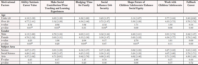 None of the variables were significant in motivating preservice students’ to remain in teaching, as seen in Table 3, which implies that regardless of gender, age, or subject area, they would pursue their teaching career for similar reasons.