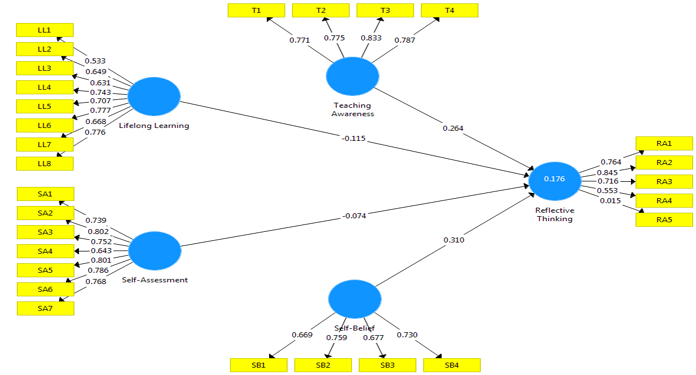 As shown in Table 3, the path coefficient between self-belief and reflective thinking is the highest (0.31), followed by teaching and reflective thinking (0.264). The square value for reflective thinking is equal to 0.176, suggesting that the amount of variance explained by the dependent variable in the model is 17.6%. The statistical significance of the relationships between the variables can be evaluated via p-values and t-statistics, as shown in