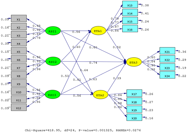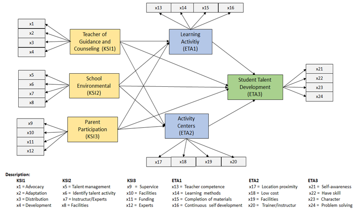 Student talent development (ETA3) is an endogenous variable influenced by the exogenous variables, KSI1, KSI2, KSI3, ETA1, and ETA2. Of the ETA3 variables, the highest contributing indicators were self-awareness (x21; 0.2880), followed by skill (x22; 0.2436), problem solving abilities (x24; 0.1936), and self-reinforcing character indicators (x23; 0.1710). Fajriyah (2013) and Maharani and Mustika (2016) emphasize the fact that developing talent can shape a student’s competencies, especially in terms of self-awareness, personality development, and emotional control (see Maharani and Mustika (2016)). The ETA3 variables also indicate the fact that developing talent will result in the acquisition of skills, especially those that are useful for work, such as the ability to solve problems and environmental issues. Veluchamy, Bera, Rajput, and Krishnan (2016) show that talent development has a positive impact on students' competencies and skills. In the context of the workforce, it appears that talent development positively affects self-efficacy, employee engagement, retention, and employee performance (Mohammed, 2015). Talent-based competency will also increase the sense of fun involved in performing an activity or job, thus directly or indirectly shaping the character and personality of students, including their sense of responsibility, discipline, hard work, self-reliance, self-esteem, behavior, and manners. Pardi (nd) suggests that developing talent supports independence, hard work, and success. Saragih (2014) argues that developing talent brings about independence, responsible behaviors, self-esteem, and discipline in terms of the achievement of self-competence.