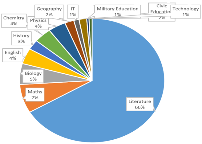 The empirical data used in this research were gathered through a questionnaire about the opinions of high school teachers and students on the teaching and learning of informational texts. The questionnaire was responded in total by 588 teachers and 2744 students from 15 provinces (out of 63 provinces in Vietnam). The majority of teachers taught Literature while others taught Mathematics, Biology, English, History, Chemistry, Physics, Geography, Civic Education, Information Technology, and Military Education. Figure 1 shows the distribution of participating teachers in a subject category. Approximately 30% of respondents came from Hanoi, Vietnam's capital city.
