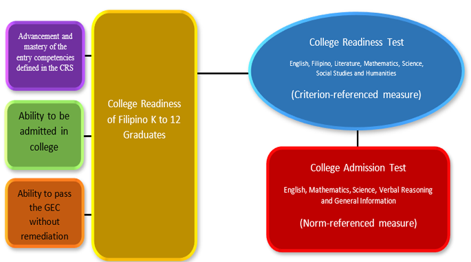 Since the K to 12 Program is a new education reform in the Philippines, the construct on college readiness is a new phenomenon that is given emphasis in basic and higher education. This scenario paved the way for the creation of a framework called the College Readiness Standards (CRS) because effective transition in college is viewed as an accountability of the basic education institutions to produce high school graduates who are ready for tertiary education. Despite the presence of this framework, there was no available standardized test measuring the preparedness of SHS graduates to hurdle tertiary education. The absence of a college readiness test creates a gap in examining the alignment of the students’ competencies in their preparation for college life. Consequently, HEIs employ different means of measuring the preparedness of students in admitting them in their various programs. As Magno and Piosang (2016) opined, there are two major implications of the transition from SHS to college in the field of assessment: (1) HEIs and schools offering Grade 12 need to diagnose readiness based on the given competencies of the college readiness framework; and (2) Entrance exams need to be built using the CRS.