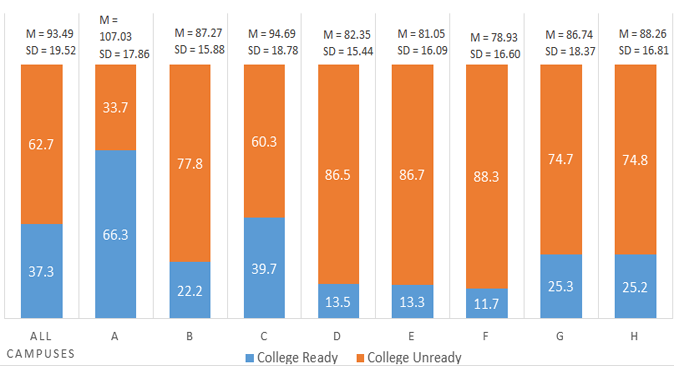 Figure 2 reveals that the respondent-university admitted more college-unready (4,722 or 62.7%) SHS graduates than the college-ready (2,811 or 37.3%) ones. The general mean score of all campuses in the CRT is 93.49, which is below the passing score of 100. This finding signifies that only 2/5 of its first-year students are prepared for college. These are the students who manifest advancement and mastery of the entry competencies defined in the CRS, have the potential to be admitted in college, and have higher tendency to pass the GEC without remediation.