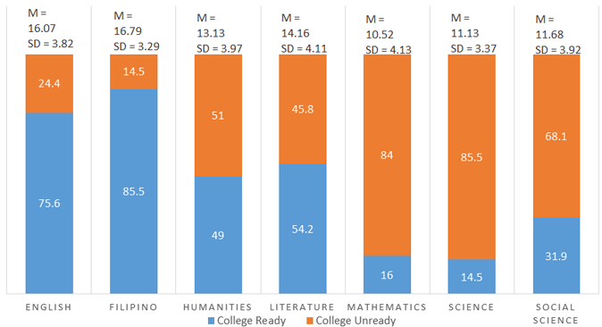 On the other hand, very few students are college-ready along Science (1,095 or 14.5%), Mathematics (1,208 or 16%), Social Studies (2, 406 or 31.9%), and Humanities (3,692 or 49%). The general mean scores of these learning areas are as follows: Science (11.13 out of 30 items), Mathematics (10.52 out of 30 items), Social Studies (11.68 out of 28 items), and Humanities (13.13 out of 28 items).