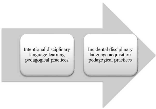 The high school teachers in this study indicated that they used intentional disciplinary language learning and incidental disciplinary language acquisition pedagogical practices, highlighting that the use of these practices happens on a continuum, as shown in Figure 1.Figure-1. A summary of the pedagogical practice used by in-service teachers.